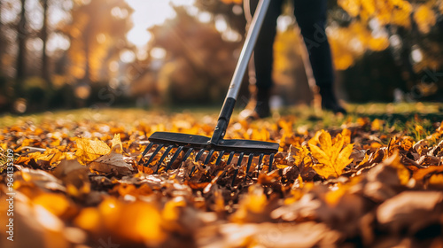 Scena ukazująca osobę grabiącą opadłe liście w ogrodzie w jesiennej scenerii. Kolorowe liście tworzą piękne tło, a postać zaangażowana w grabienie odzwierciedla typowe czynności sezonowe.