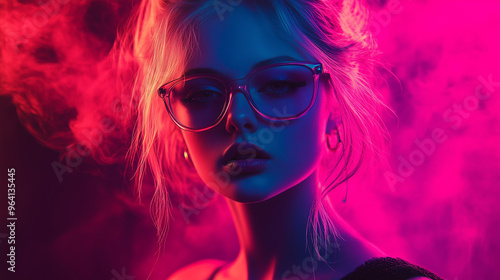 Portret młodej dziewczyny z blond włosami, noszącej okulary, otoczonej delikatnym dymem i neonowym oświetleniem.