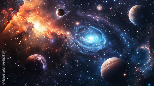 Przestrzeń kosmiczna w bogatej palecie kolorów, z rozświetlonymi gwiazdami, złożonymi konstelacjami, wirującymi galaktykami oraz mieniącymi się mgławicami.