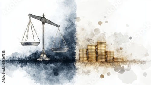 A symbolic representation of justice and finance, featuring a balance scale on one side and stacks of coins on the other.