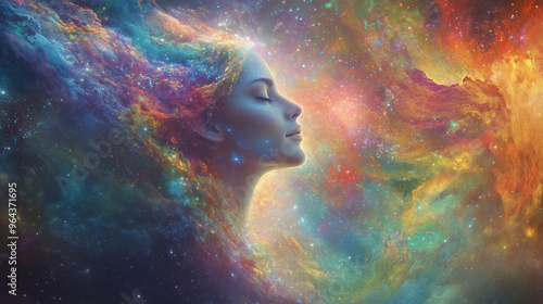 Kobieta w formie astralnej, jej ciało zdaje się być rozpuszczone w oceanie żywych, wirujących kolorów. Psychodeliczne, świetliste wzory i energia ożywają wokół niej, tworząc wrażenie, że jest w stanie