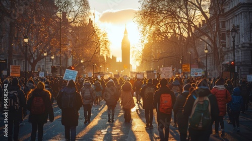 A large crowd of people marching and protesting in the streets of a city at sunset, carrying signs and banners, with the iconic Big Ben clock tower visible in the background