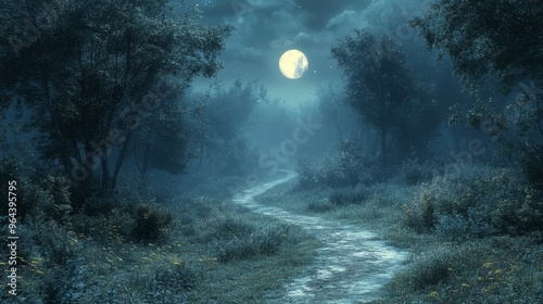 A moonlit path in a forest, leading to nowhere, [aimlessness], [lost in life’s journey], 3D illustration