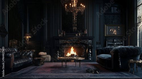 Tajemniczy salon wampiryczny na Halloween charakteryzuje się eleganckim, ale złowieszczym wystrojem.