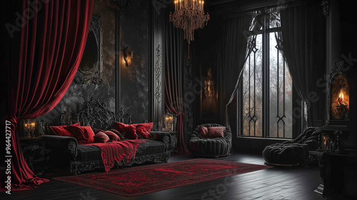 Tajemniczy salon wampiryczny na Halloween charakteryzuje się eleganckim, ale złowieszczym wystrojem.