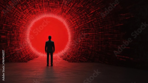 AI guardian figure standing in front of a massive digital gate, blocking a stream of red malicious code, representing ultimate cyber defense