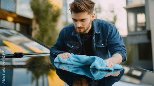 Mężczyzna z pełnym skupieniem przeciera samochód ściereczką z mikrofibry, usuwając kurz i smugi z powierzchni.