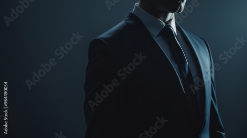 Partial view of a man in a suit against a minimalist dark background, emphasizing the smart and formal wear.