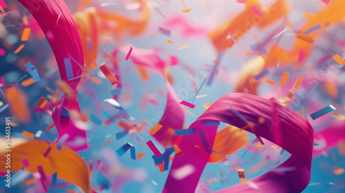 explosion festive de rubans colorés et de confettis flottant dans un ciel bleu vif, esprit de célébration et de joie, parfait pour événements spéciaux et fêtes, anniversaire, etc