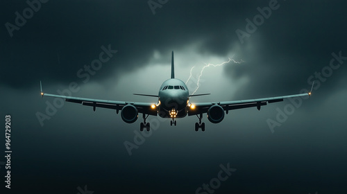 A commercial airplane approaches, flying directly towards the camera against a dark stormy sky with visible lightning in the background. The aircraft's lights shine brightly.