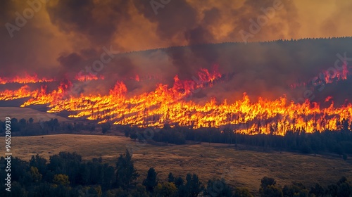 A horizon ablaze with wildfires stretching across a dry forest, representing the catastrophic increase in fire incidents fueled by changing climate conditions and dry weather.