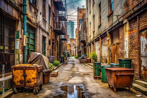 A rundown, grimy, and neglected alleyway with peeling walls, rusty dumpsters, and broken furniture, evoking a sense of