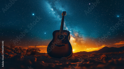 Acoustic Guitar Under Milky Way Galaxy Night Sky