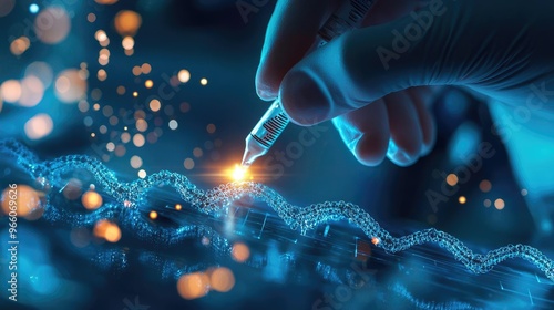 Close-up of a hand injecting serum into a DNA strand, symbolizing genetic research and biotechnology advancements.