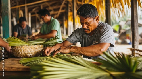 Traditional artisans crafting with palm leaves, showcasing detailed manual labor and cultural heritage in a rustic setting.