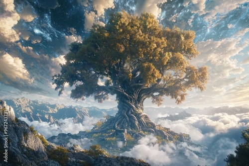 Ancient Yggdrasil Tree of Life Above the Clouds in a Mystical Landscape.