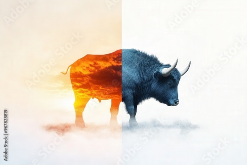 Surreal image of a bull in a dual landscape, transitioning from a fiery sunset to a frosty, misty environment, blending nature and imagination.