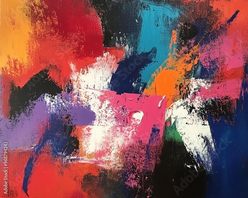 Vibrant abstract expressionist painting featuring textured brush strokes that convey strong emotions and bold colors
