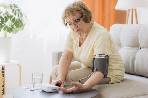 Senior woman with hypertension measuring blood pressure herself at home. Sad Elderly lady measure blood pressure using tonometer. Everyday health check-up