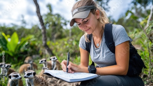 A field researcher with a journal documents the behaviors of meerkats in their natural environment, illustrating hands-on wildlife research and scientific observation.
