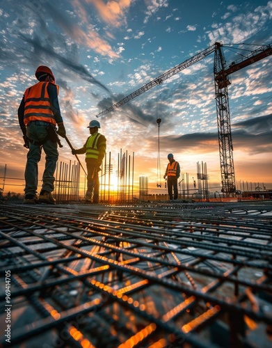 Construction workers collaborating at sunset on a building site with cranes and a vibrant sky in the background