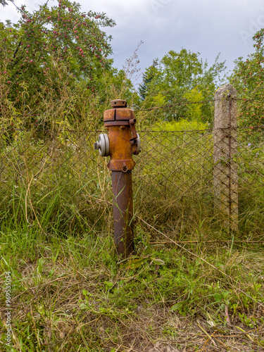 stary zardzewiały hydrant stojący przy starym ogrodzeniu z siatki