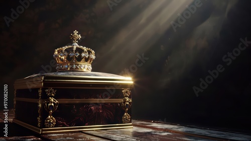 A majestic crown resting on an ornate chest, illuminated by soft rays of light, symbolizing royalty and treasure.
