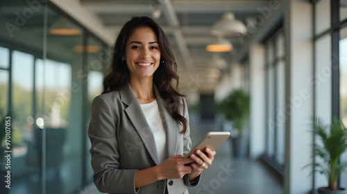 Happy young Hispanic professional business woman using tab standing in office. Happy businesswoman manager female executive leader holding tab at work