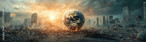 An Earth globe amidst a devastated urban landscape, symbolizing environmental destruction and the urgent call for ecological recovery.