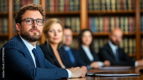A group of lawyers in a professional training session, sitting around a large oval table in an elegant conference room