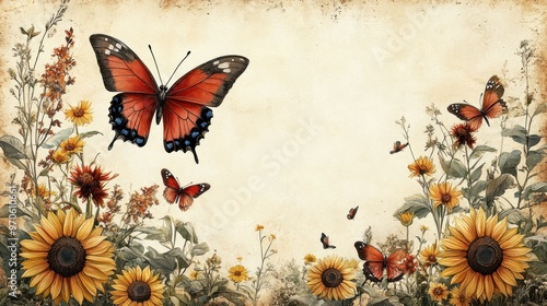 A vintage-style illustration featuring butterflies and sunflowers.