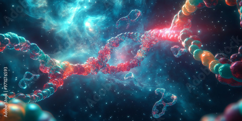 A vibrant render of molecular DNA strands floating in space, glowing in shades of red, blue, and green, with a cosmic nebula swirling in the distance.