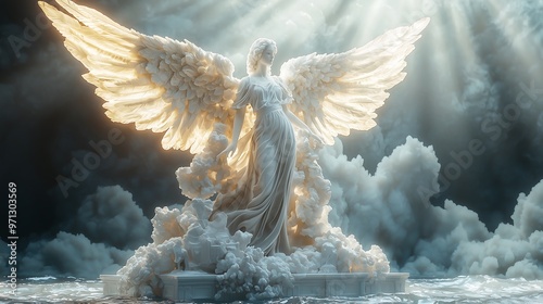 Celestial Warrior with Luminous Sacred Circle and Extended Wings Guarding the Gates of Paradise.Generative AI 輝く聖なる円と広がる翼を持つ天界の戦士が楽園の門を守護する情景