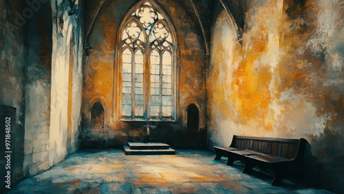 Solemn Decay: Textured Oil Painting of a Shabby Medieval Church Interior