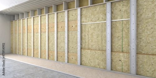 Plasterboard wall in section showing layers with noise insulation, plasterboard, wall, section