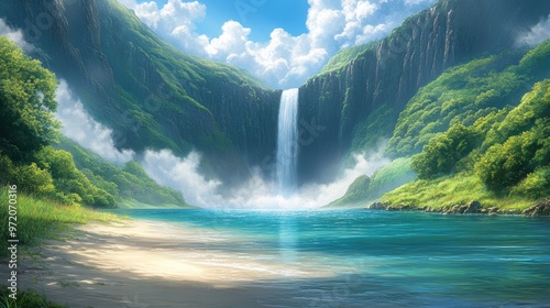 A hidden tropical oasis with a majestic waterfall, mist rising as the water splashes into a turquoise lagoon