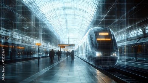 Futuristic Train Station Platform with Wireframe Train and Passengers in a Modern City.