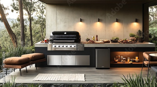A sleek outdoor kitchen featuring a stainless steel grill, spacious counter space, a refrigerator, and modern seating,