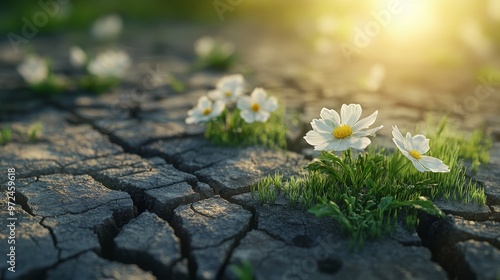 Metaphor of healing transformation from cracked ground to blooming flowers and lush greenery