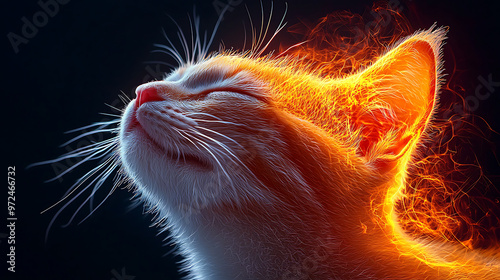 Un gato naranja con los ojos cerrados bajo un efecto de luz naranja