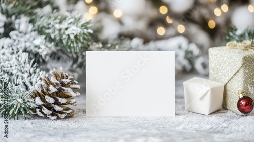 Blank Card Mockup with Snowy Pine Branches and Bokeh Lights