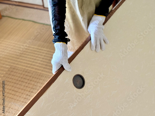 ふすまを運ぶ軍手をした手元