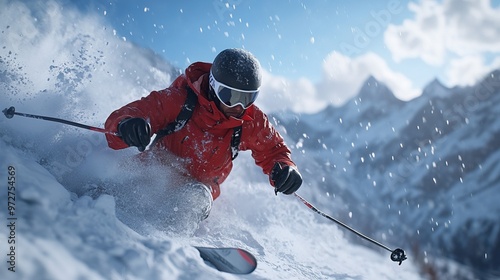 Skier tackling a challenging mogul field on a snowy mountain, with sharp turns and snow flying in every direction. 4K hyperrealistic photo.
