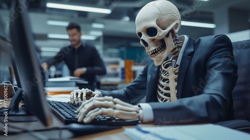 A skeleton dressed in a business suit, working diligently at a desk in a typical office setting. The skeleton is focused, typing or writing as if absorbed in the task.