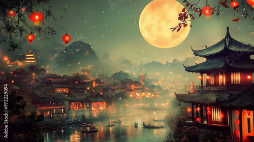 moon festival, mid-autumn festival, lantern and chinese ancient city