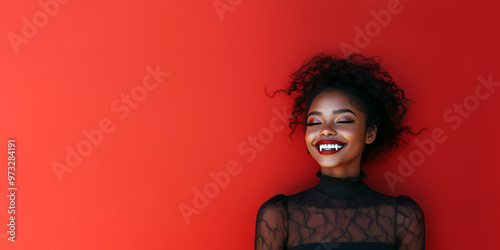 Black woman vampire. A smiling african woman with vampire fangs on a red background with copy space for text. For party invitation, Halloween poster