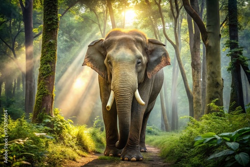 A majestic Asian elephant, species elephas indicus, stands in a lush forest, its wrinkled gray skin and tusks