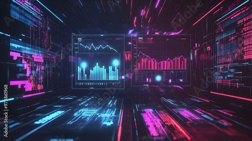 A 3D illustration of two holographic comparison charts displaying key competitive analysis data points, with arrows and indicators showing differences in growth and revenue, set in a futuristic