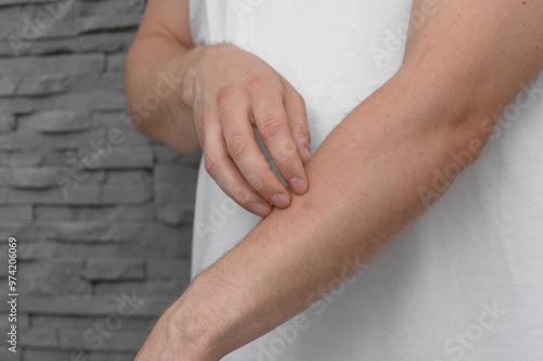 Mężczyzna drapie się po swojej dłoni, swędząca pokrzywka