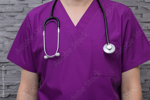 Lekarz w ubraniu roboczym szpitalnym na tle szarej ściany, szpital leczenie ludzi